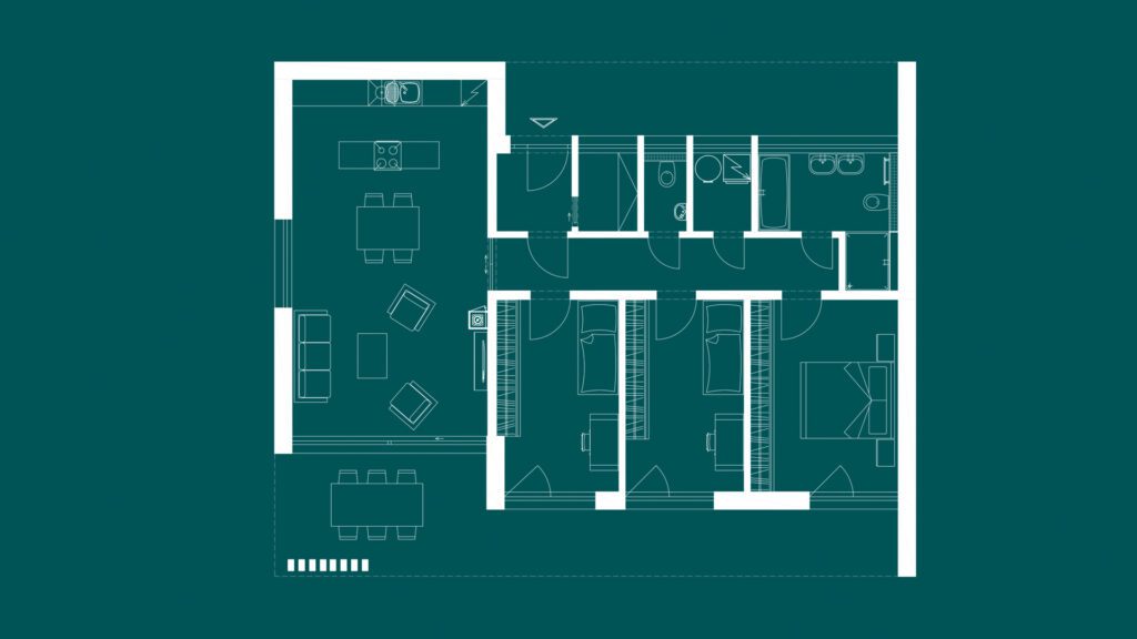 Dispozice domu ALENA je výjimečně promyšlená. Část domu je mírně zasunutá, což umožňuje vytvoření prostorného závětří u vstupu a kryté terasy na druhé straně. Tato terasa je ideálním místem pro klidné posezení, jak pro obyvatele, tak pro případné návštěvy, které toto provedení zajisté ocení. Je propojena s obývacím pokojem a přístupná z každé z tří ložnic, což zajišťuje snadný přístup do zahrady bez narušení soukromí ostatních.